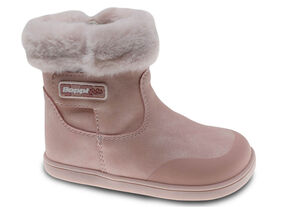 Bota de bebé BAREFOOT, leve, flexível. Criada para favorecer o movimento natural do pé. Em pele sintética, com gola em pelo. Fecho de correr para calçar e ajustar facilmente. Palmilha removível. Sola de borracha, antiderrapante, sem desnível, biqueira ampla, que permite maior liberdade dos dedos do pé do bebé. Flexível.