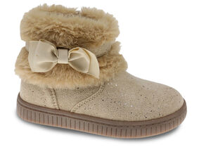 Bota infantil em microfibra, com gola em pelo e laço decorativo. Fecho de correr para calçar e ajustar facilmente. Sola de borracha e antiderrapante.