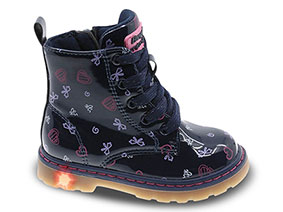 Bota infantil em pele sintética. Sistema de aperto com cordão e fecho de correr para calçar e ajustar facilmente. Sola com luz LED para um andar divertido.