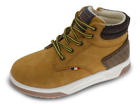 Bota juvenil, em pele sintética, com gola em têxtil. Sistema de aperto com cordão e fecho de correr para calçar e ajustar facilmente. Sola de borracha e antiderrapante.