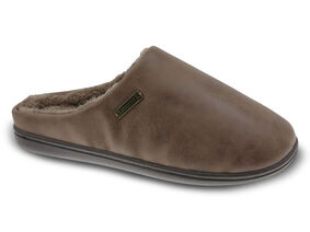 Chinelo interior para homem em pele sintética. Forro quente e confortável. Sola antiderrapante de borracha, com design exclusivo.