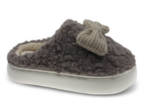 Chinelo interior para senhora em têxtil, com laço decorativo. Forro quente e confortável. Sola antiderrapante.