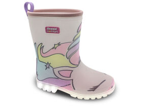 Galocha infantil em borracha, com estampado "unicórnio". Sola com luz LED para um andar divertido.