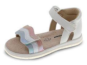 Sandália de bebé, em pele sintética com acabamento metalizado. Aperta com velcro para calçar e ajustar facilmente. Palmilha anatómica 100% pele. Sola antiderrapante de borracha.