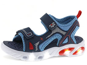 Sandália infantil, em pele sintética e têxtil. Aperta com velcro para calçar e ajustar facilmente. Sola com luz LED para um andar divertido.