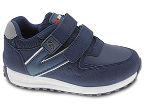 Sapato casual em pele sintética e nylon. Aperta com velcro para calçar e ajustar facilmente. Sola antiderrapante de borracha.